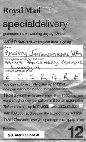 Royal Mail receipt for letter posted to Amnesty International UK on October 14th 2002: |