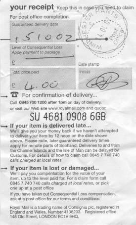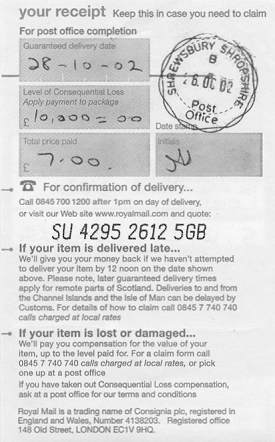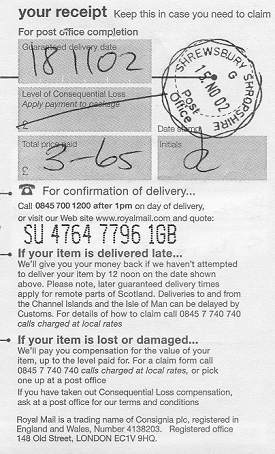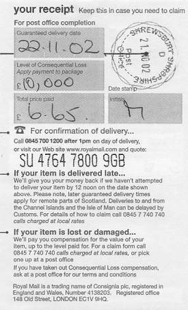 Royal Mail receipt for letter posted to London Police on October 26th 2002: |
