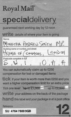 Royal Mail receipt for letter posted to Minister Andrew Smith on November 21st 2002: |