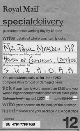 Royal Mail receipt for letter posted to Paul Marsden MP on November 15th 2002: |